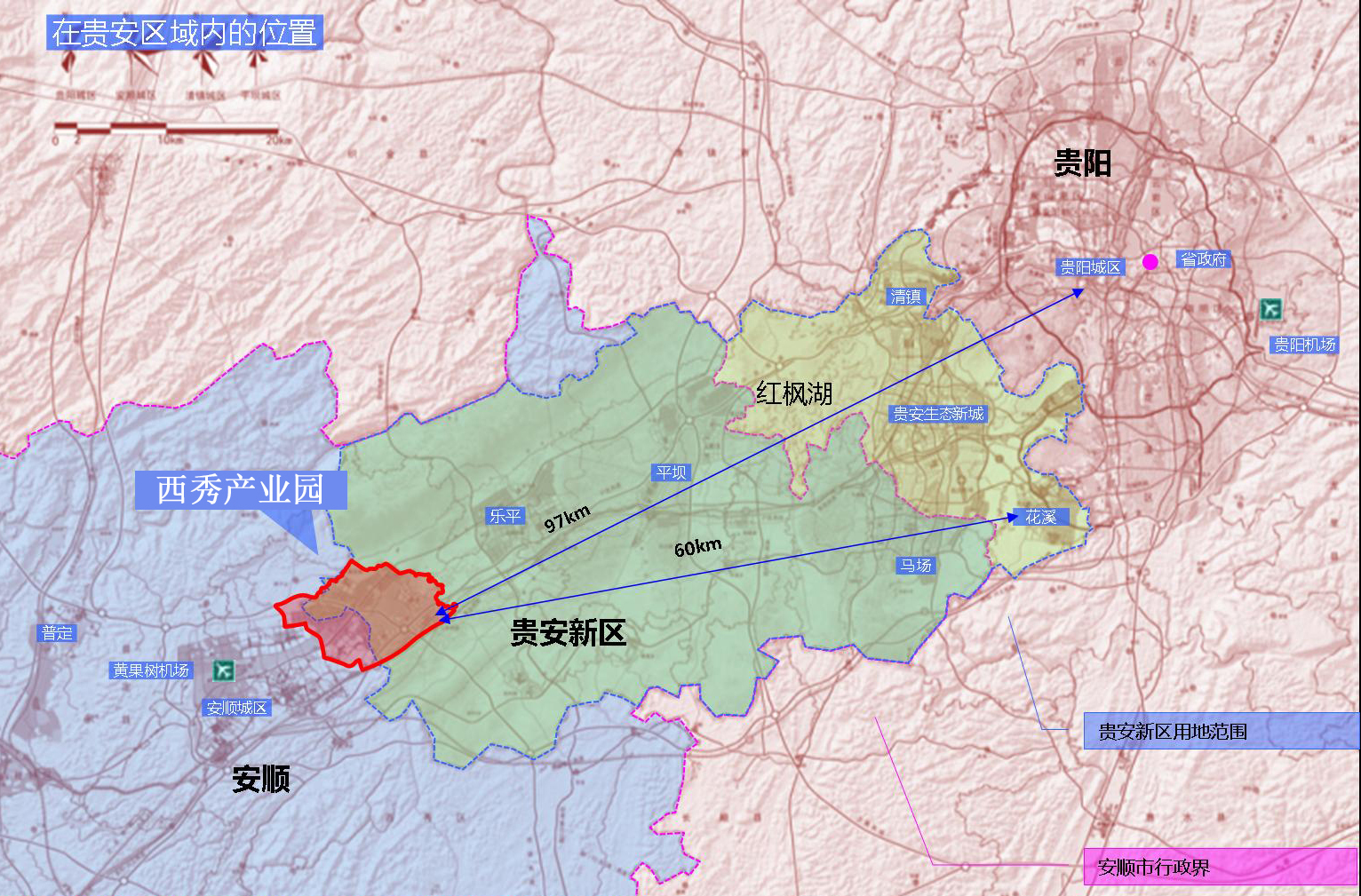 具备产业发展需求的优越区域位置:西秀产业园区地处贵安新区西端、安顺主城区东部,距离贵安新区约58km,距离贵阳城区约97km,距黄果树机场约10km,距龙洞堡国际机场约100km,临近安顺主城区,是安顺主城区与贵安新区的“铰接点”,是安顺主城区融入贵安一体化发展的首发区域。西秀区是地级安顺市所在地,全市政治、经济、科技和文化中心,素有“黔之腹、滇之喉、粤蜀之唇齿”、“扼锁滇黔”之称,历来被视为黔中“旱码头”,“商业之盛,甲于全省”。园区规划面积为37.6平方公里,位于安顺市中心城区东北4km,是贵州中西部的交通枢纽。